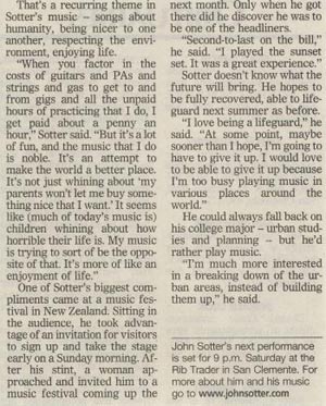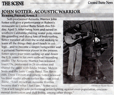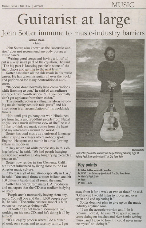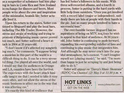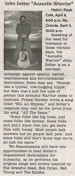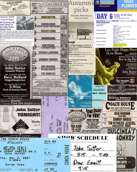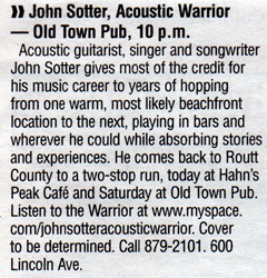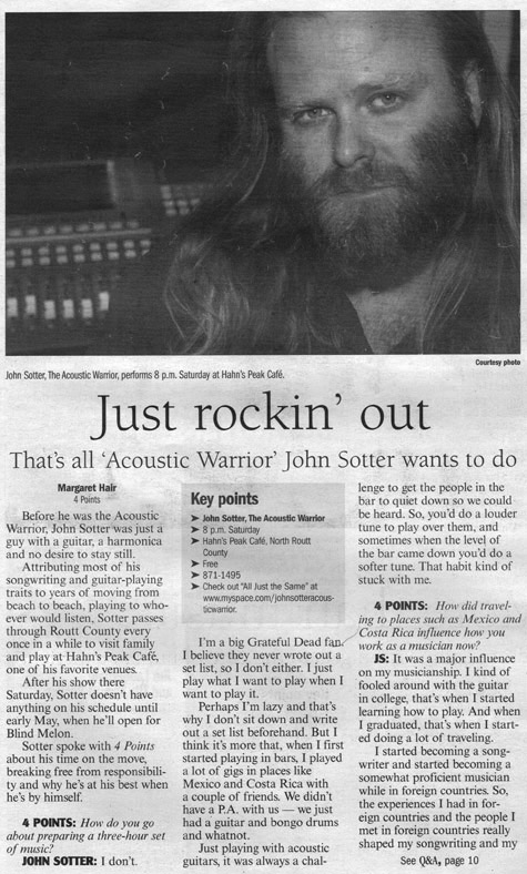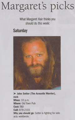 Are you a member of the press seeking a high-res picture? Click on the pictures below to open them up in another window where they will be at 300 dpi (jpeg). Want something else? E-mail: johnsotter@johnsotter.com Below these pictures are a few examples of articles that have been previously published. There's a one-sheet/bio here in pdf format. Wanna help promote an upcoming show? Click here and print a poster.